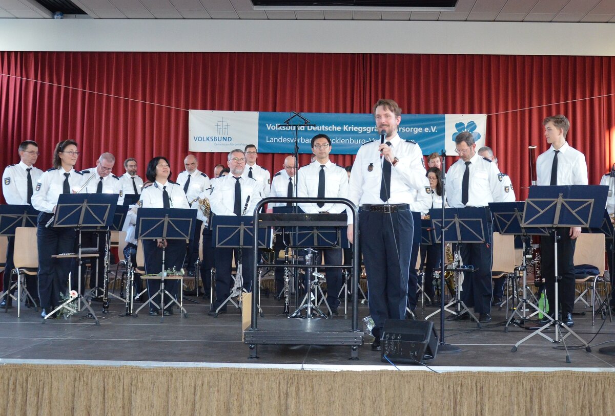 Spritzig moderiert von Katrin Lièvre, brachte das Landespolizeiorchester M-V unter der Stabführung von Cornelius During-Schwarzmaier Tanz-, Operetten- und Marschmusik ebenso gekonnt zu Gehör, wie solistische Beiträge auf dem Xylophon oder das lustige Gesangsduell zwischen Orchestermanagerin Luise Eckhardt und Solosängerin Katrin Lièvre. Der Regionalverbandsvorsitzende, Bürgermeister a.D. Dr. Michael Koch, konnte zu Beginn der Veranstaltung neben dem Schirmherrn, Bürgermeister Thomas Witkowski, auch den Präsidenten der Stadtvertretung Eckhardt Tabbert und Altbürgermeister Ernst Wellmer herzlich begrüßen. Als Vertreter der Landesgeschäftsstelle waren zudem der neue Jugendreferent Till Hennings und Colette Schröder vom Sekretariat zugegen, die gemeinsam mit Regionalverbandsgeschäftsführer Jörg Küthe den immer dicht umringten Informationsstand betreuten. Dr. Koch übermittelte herzliche Grüße von MSE-Landrat Thomas Müller, der erst kürzlich zum Kreisvorsitzenden des Volksbundes berufen worden war, und informierte über Ergebnisse der umfangreichen Verbandsarbeit vor Ort und überregional. Bürgermeister Thomas Witkowski würdigte in seinem Grußwort die Arbeit der Volksbundmitglieder und den Einsatz des Landespolizeiorchesters zur Unterstützung dieser wichtigen Sache. „Ich möchte an dieser Stelle betonen, wie sehr ich die Zusammenarbeit mit dem Demminer Regionalverband schätze. Diese Art von ehrenamtlichem Engagement ist gerade in der heutigen Zeit von unschätzbarem Wert und verdient unsere hohe Anerkennung.“