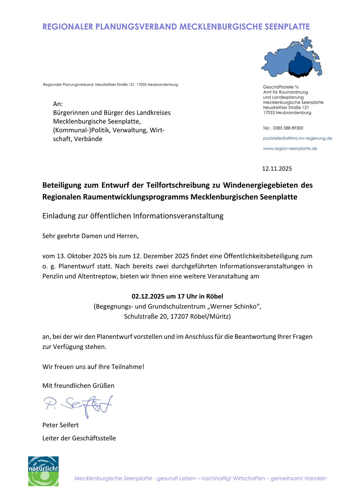 vom 13. Oktober 2025 bis zum 12. Dezember 2025 findet eine Öffentlichkeitsbeteiligung zum o. g. Planentwurf statt. Nach bereits zwei durchgeführten Informationsveranstaltungen in Penzlin und Altentreptow, bieten wir Ihnen eine weitere Veranstaltung am