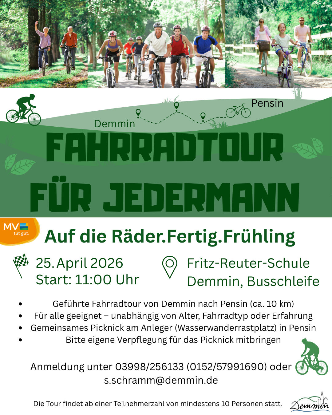 Am 25.04.2026 laden wir Sie herzlich zu unserer gemeinsamen Anradel-Tour in Demmin ein! Unter dem Motto „Auf die Räder. Fertig. Frühling.“ starten wir sportlich und gut gelaunt in die neue Fahrradsaison. Die geführte Tour ist für alle geeignet – ganz egal ob jung oder alt, mit welchem Fahrrad Sie unterwegs sind oder wie viel Erfahrung Sie mitbringen. Gemeinsam fahren wir von Demmin nach Pensin und genießen dabei auf einer Strecke von ca. 10 km den schönen Radweg in frühlingshafter Atmosphäre.